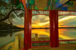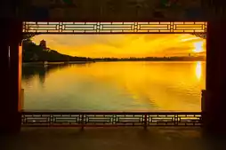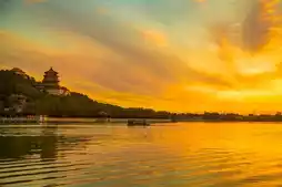 1️⃣ Kunming Lake shore → The golden sunlight shimmering on the lake is magnificent