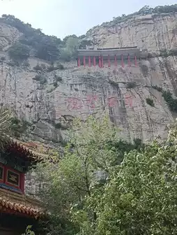 A Ming Dynasty architectural complex embedded in the cliff, with vermilion corridor pillars paired with cedar trees creating stunning views