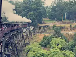 The scenery is varied and layered, from the rich hues of the forest, gullies, and fern fields to alpine meadows and lakes. The train passes historic wooden bridges along the way, such as the Monbulk Creek trestle bridge, perfect for photo opportunities and immersive viewing.