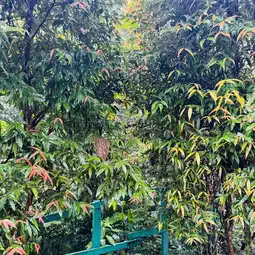 Wandering around the garden, I spotted clusters of bright purple berries hanging like treasures among the green leaves. They looked like tiny grapes, sparkling with raindrops under the misty air.