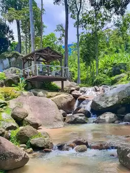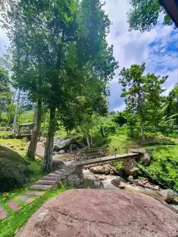 Our room had a balcony overlooking a waterfall, so serene and picturesque. Surrounded by pine trees, a river trail, and fresh air, it truly felt like being embraced by nature. We spent time walking along the river, relaxing in the wooden pavilion — such a peaceful vibe.