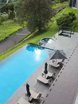 The panoramic view of the steam and ocean from the infinity pool creates a resort-like atmosphere.