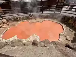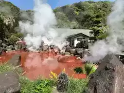 Blood Pond Hell (ちおけじごく) features water colored bright red due to iron oxide, resembling a boiling pool of blood. The sight is both terrifying and magnificent. As one of Japan's oldest natural hells, it has historically been used to produce hot spring mud dye. The park's shop sells unique products made from the hot spring mud.
