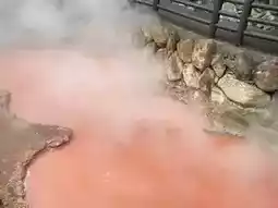 Jigoku Meguri amidst vibrant colors: Stroll through the eight "hell" hot springs, especially "Umi Jigoku" (Sea Hell) with its turquoise blue waters and "Chinoike Jigoku" (Blood Pond Hell) with its crimson red waters. These springs are set against a backdrop of mountains and trees turning red and yellow, perfectly contrasting with the rising hot steam.