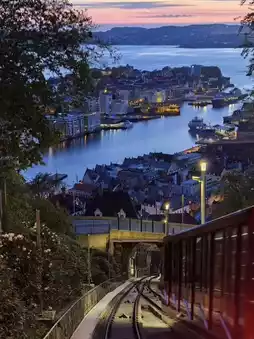 Fløibanen is a mountain cable car that goes directly from the center of Bergen to the top of Fløyen Mountain. It has been in operation since 1918. The ride takes only about 6-8 minutes, and the altitude difference is about 302 meters. It is a must-visit experience to enjoy the beautiful scenery of the city and the fjord.