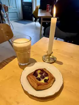 Stopped by a cozy café for a candlelit breakfast of latte and a fresh berry Danish—so simple, so comforting.