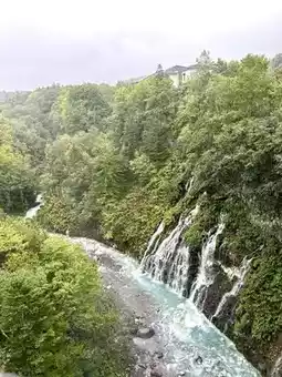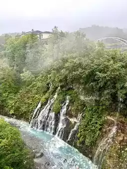 A waterfall where groundwater from the Tokachi mountain range flows down from a crack in the lava layer into the Biei River like a white beard.