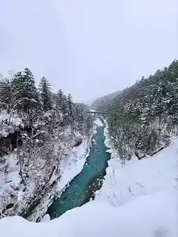 Just a few minutes away, Shirahige Falls flows down a deep gorge, framed by thick snow and ice. The view from the bridge is breathtaking — a must-see for winter photography lovers.