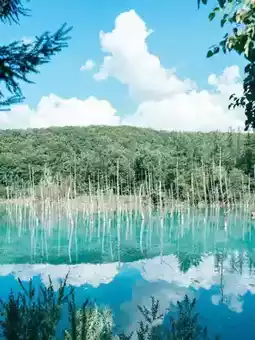 The Blue Pond in Biei is a magical landscape where the standing dead birch trees and the crystal-clear water surface intertwine. When the wind occasionally creates ripples, the light shimmers as if the pond is alive. It's a place that helps you forget the everyday hustle and allows your heart to unwind.