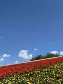 ・The "Patchwork Hills" feature colorful bands of flowers planted in rows, creating a stunning view.