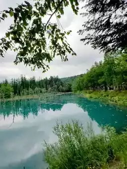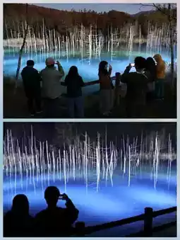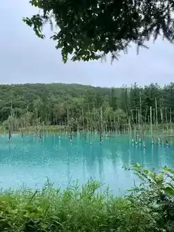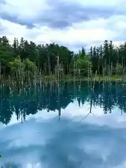 The famous scenic spot "Shirogane Blue Pond" in Biei Town, Hokkaido, is a natural wonder formed by the mineral precipitation of the nearby Tokachi-dake volcano and is included in the Hokkaido Nature Reserve. The Shirogane Blue Pond is an artificial lake, which was created to prevent the disaster of volcanic mudflow caused by the accumulation of materials after the eruption of Tokachi-dake. The water surface is famous for its mysterious blue and dead branches, which is full of artistic conception. The water surface changes to different blues in the four seasons, and you can enjoy different blue changes; in early spring when the snow melts, it is blue; in early summer, it is clear sky blue. The contrast between the new green and the azure blue, the autumn red is reflected on the water surface, and it freezes into a silvery white in the cold winter. The four seasons change, taking you to appreciate the different styles of the Blue Pond, and it is also beautiful to visit at night. Finally, the most popular thing to eat is the Blue Pond ice cream, "Blue Pond Soda" and other famous products of the Blue Pond.