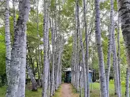 Outside there is a corridor of white birch trees, the tranquil beauty of nature.