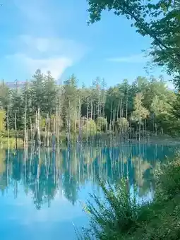 Your destination is the famous "Shirogane Blue Pond"! The emerald green pond looks like a painting.