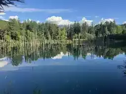 • Standing in the pond are birch trees and deadwood, whose reflections on the blue water create a surreal scene.