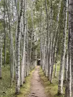 The contrast of white and green created by the straight rows of birch trees is almost like a painting.