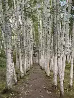 The straight rows of birch trees create a tunnel-like scene. The contrast between the white trunks and green leaves is beautiful, creating a mystical atmosphere.