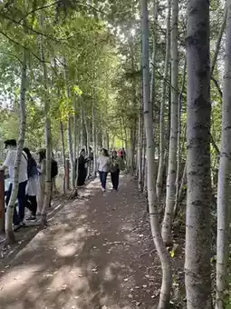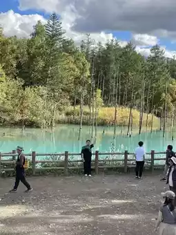 As soon as we walked in, we were greeted by a crystal-clear blue pond, just like in a postcard. The water was a beautiful turquoise hue, surrounded by forests and trees that were just starting to change color. 🍂 It felt like we were transported into an anime.