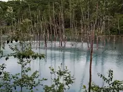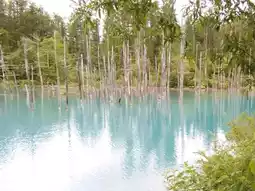 The standing withered trunks of Japanese larch and birch trees in the pond create a striking contrast with the translucent blue water, evoking an otherworldly scene. This unique blue hue results from the scattering of sunlight by microscopic particles (colloids) formed when minerals such as aluminum from upstream hot spring water mix with the water of the Biei River. As the seasons change, the pond displays varying shades of blue, making it a must-visit destination for photographers and travelers alike.