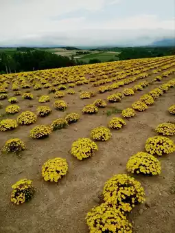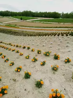 Strolling through Shikisai-no-Oka in Biei, Hokkaido, the flower fields unfold like a vast palette spread across the earth. From delicate golden globes (chrysanthemums) to charming pansies and rows of vibrant orange marigolds, blossoms cascade over the rolling terrain in layered, colorful profusion. In the distance, green hills and farmlands stretch under skies adorned with drifting clouds, composing a pastoral scene unique to Hokkaido—a breathtaking spectacle of nature's artistry.