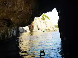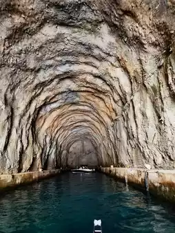 Kotor Bay, Europe's southernmost fjord and the most indented part of the Adriatic Sea, is one of Europe's best natural harbors, renowned as "the most beautiful bay in the Mediterranean," with its sparkling, golden-hued waters. A boat trip to the Blue Grotto (Figure 3) is one of Kotor Bay's most popular and visited attractions. Sunlight shines through the cave entrance, dyeing the cave's seawater a captivating blue. The water is icy cold, yet foreigners dare to swim in it (Figure 4), which is admirable. In Kotor Bay, you might also spot a deep cave on the water's surface (Figures 6, 7). It is said that these water tunnels were built during the Tito era of former Yugoslavia to conceal strategic submarines, with a total of three such hidden submarine tunnels constructed in Kotor Bay.