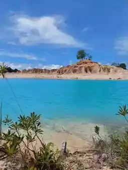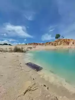 The place is actually an old mining area that was abandoned and created a beautiful crystal clear lake. The place is wide and all you can see is white sand beyond the horizon and the lake. Better to visit while using your hat or umbrella at noon, since the sun is really hot at that time, and there is no shade in the area. And it feels like a desert.