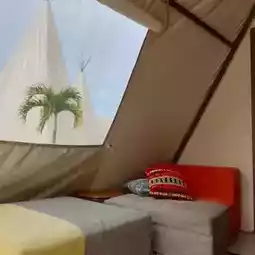 About this accommodation: air-conditioned teepee-style tents, each equipped with modern amenities such as private bathrooms, patios, and outdoor furniture. Is super comfortable and cozy.