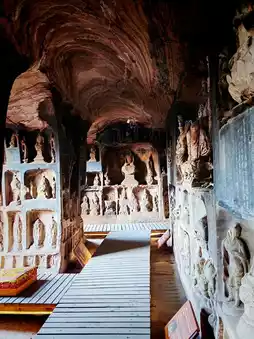 The Big Buddha Cave is the largest cave, housing the largest Buddha statue in Shaanxi Province, which is 20 meters high. The Thousand Buddha Cave is a large central pillar cave with a nearly square plan. The niches inside the cave are arranged in a disorderly manner, and most of the statues are works from the reign of Wu Zetian. The Arhat Cave is slightly smaller in scale and has a special shape. It is an unfinished central pillar cave, and the statue style is similar to that of the Thousand Buddha Cave.