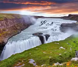 - **Gullfoss (Golden Falls)**: The waterfall roars like a thousand galloping horses, its torrents cascading down and creating mist that forms dazzling rainbows in the sunlight—both majestic and breathtakingly beautiful.