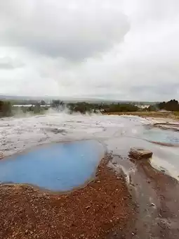 The surrounding geothermal field is otherworldly—pools shimmer with unreal blues and oranges, and the ground pulses with heat. There’s a strange silence between eruptions, broken only by the wind and the bubbling earth beneath your feet.