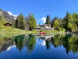 Though Blausee is relatively small, taking about an hour to walk around, photography enthusiasts might find even two hours insufficient to capture its beauty! Besides hiking around the lake, visitors can also take a ride on the iconic red boat. The lake's transparent waters make the boat appear as if it's floating in mid-air—an absolutely magical sight!