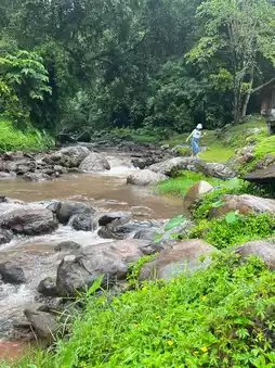 Long Khao Cafe 🏕️ is a camping-style cafe in Bo Kluea District, Nan Province. It is located in the middle of the forest, next to a stream. Inside, there is a spacious area with many tables to choose from, both along the stream and in the shady area. There are many drink menus such as coffee, tea and smoothies, as well as cakes and bakery. 🍰☕️