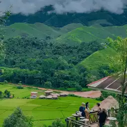 It is a cafe surrounded by mountains and has a green rice field below. During the rainy season, you can see the fresh green rice fields like this. It goes well with the green of the mountains and the fog. It feels like you are abroad.