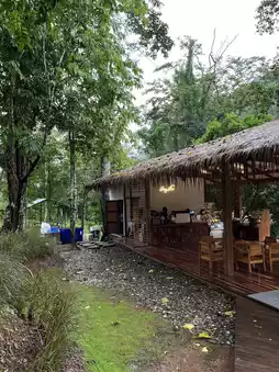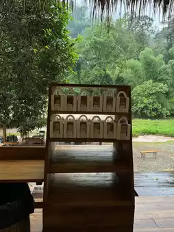• An open-air wooden cafe designed in a riverside camp style. Seating options include tents, wooden chairs, and a relaxing streamside setting amidst lush greenery. 🌲