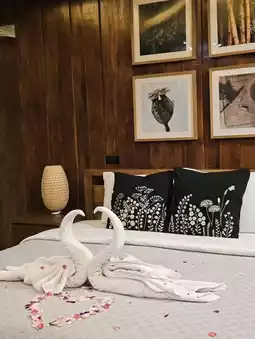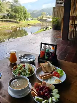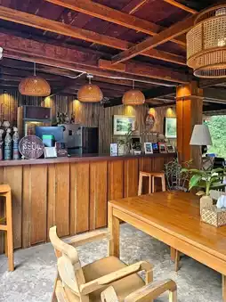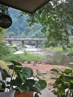 We stayed in Room No. 3 (price: 5,500 ฿). On the left side, you can see the ozone bridge, while the right side offers a view of the stream and mountains from the balcony. The staff acted as excellent concierges, beautifully preparing the room for turn-down service, and arranging dinner and breakfast thoroughly. They didn’t interfere with activities or sleeping schedules. The common area played instrumental music throughout the day.