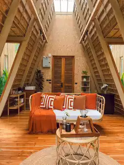 The wooden cottage and A-frame house rooms are simply decorated yet inviting. 🍃 The interiors are clean and spacious, and the windows offer panoramic mountain and nature views. 🏞️