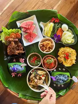 What's special about the food! 🍲🥗 They offer a traditional khantoke-style dinner featuring chili paste, fresh vegetables, authentic Northern Thai cuisine with bold flavors, and refreshing fruits. They also offer a small shabu hot pot by the stream—perfectly satisfying! 🫕✨