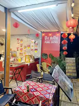 Pang Saphan, a charcoal-roasted bread shop in Saphan. This cute and inviting place is located on the way up to Yud Wela Cafe (a little past Krua Phlap Phlueng). They have a wide selection of breads, including Nutella bread, Hokkaido milk bread, and Ovaltine bread. They also have a wide selection of drinks, including coffee, cocoa, tea, milk, soda, and smoothies.