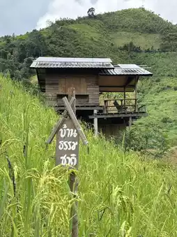 Baan Thammachat is located along the route up to Huai Mi, not far from Saphan (next to Ban Pan Suk). The most beautiful season is the rainy season, when the mountains are a deep green as far as the eye can see. Although we arrived in early October, the corn was already turning yellow, but it was still as beautiful as the picture.