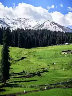 Nalati Grassland: Part of the Gongnaisi Grassland in Ili Kazakh Autonomous Prefecture, Xinjiang, it's one of the world's four great grasslands. Lush green grass and blooming flowers stretch endlessly, with snow-capped mountains in the distance and herds of cattle and sheep nearby, along with Kazakh yurts and horses, painting a beautiful pastoral scene.