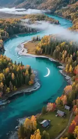 🌄 Day 3, opening the wooden door of a cabin in Hemu Village, morning mist like silk wrapping the white birch forest, smoke curling up, like a fairy tale world;