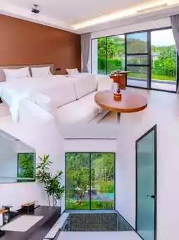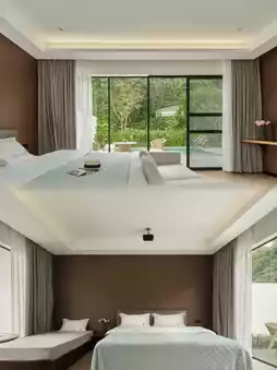 Each guest room is an independent artistic space. Hidden aromatherapy systems behind the headboards release pine fragrance. The bedding uses Hakka blue-dyed fabric, bath products are presented in Song dynasty-inspired celadon porcelain containers, and the minibar contains preserved plums and tangerine peels from Huizhou's time-honored brand "Zhimei Zhai." Most ingeniously, the smart system adjusts the room's lighting according to the time of day—simulating sunrise in the morning and automatically switching to a Nankunshan firefly mode at night.