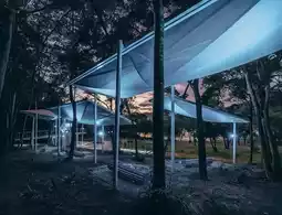 “Fengmei Post” is located in the dense forest beside Guoqian Village at Xiangang Reservoir, Luofu Mountain, Huizhou. Here, you can enjoy coffee, use the restroom, and wash and repair bicycles, fully meeting the needs of cycling enthusiasts by providing a dedicated space for rest and energy replenishment. The roof in the dense forest looks like a casually removed fluttering garment, with a light veil gently lifted by the breeze, flying and dancing among the green trees. The materials chosen are membrane fabric and fine steel wires, creating a soft and flexible form that invites people to let go of the heavy burdens of life and feel the tranquility and freedom brought by exercise and nature, welcoming visitors in a relaxed state.