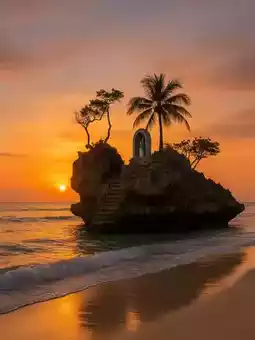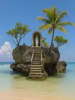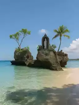 Atop the rock stands a statue of the Virgin Mary, making it a symbol of faith for locals and a popular photo spot for travelers. During high tide, the water reaches waist level, but during low tide, you can easily walk to the rock.