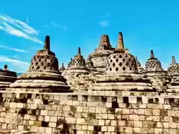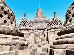 Borobudur, located northwest of Yogyakarta in Indonesia, is the world's largest Buddhist monument. Built between the 8th and 9th centuries, it consists of over two million volcanic stones and was designated a UNESCO World Heritage Site in 1982. The structure is shaped like a massive stupa and is divided into nine levels: the square base symbolizes the realm of desire, the middle square platforms represent the realm of form, and the upper circular platforms signify the formless realm. Ascending the circular staircases, visitors can admire over 2,600 intricate reliefs depicting Buddhist teachings and stories. The top level features 72 bell-shaped stupas surrounding a grand central stupa. Witnessing the stone towers and surrounding volcanoes emerge from the morning mist at dawn is a breathtaking experience cherished by countless travelers.