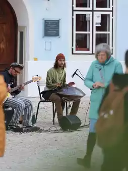 The young musician playing the handpan in front of the blue building isn’t trying to be demanding. Just let the soft sounds linger with the cool city breeze.