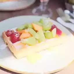 The crispy waffle topped with fruits and cream on a mildly sweet dough will undoubtedly be an impressive gourmet experience 🧇