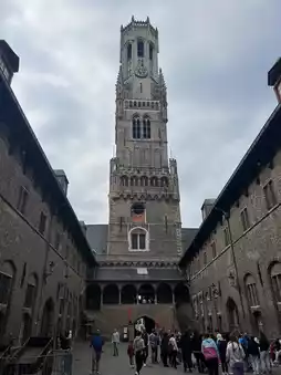Traditional houses with colorful roofs lined up, the Belfry Tower that seems to pierce the sky,