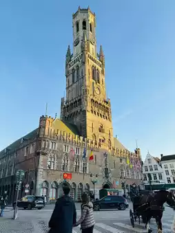 Bruges' Belfry towers over the city center, a giant guardian, bearing witness to the medieval town's centuries of splendor and transformation. Standing at the foot of the tower, the tower's red brickwork and intricate carvings are breathtaking, each floor revealing the depth of history and the craftsman's ingenuity.