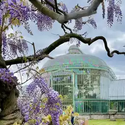 The atmosphere is regal yet enchanting, where monumental glass domes filled with exotic plants contrast with manicured royal gardens outside. Walking through the interconnected pavilions feels like stepping into a living palace of glass, where the scent of blooming flowers mingles with the filtered light of ornate ironwork. The serene setting is heightened by the seasonal timing of visits, as the greenhouses open only briefly each year during spring.