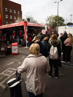Our friend stood in the middle of the line, holding a Euro note that the vendor had specially accepted, as he had no money in his pocket. We stood waiting beside a tall table made from old beer barrels, holding a fresh bottle of wine we'd just picked up from the market's wine corner.